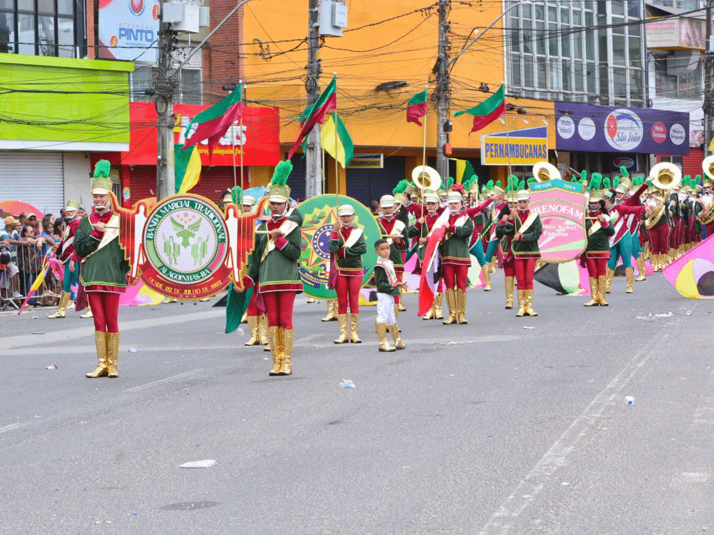 Estudantes da Rede Municipal de Educação apresentaram vivências do projeto “Alagodé: Educação nascente dos tons, saberes, sabores e fazeres das gentes!”, desenvolvido ao longo do ano letivo. Marcaram presença o Colégio Murilo Cavalcante, que trouxe sua fanfarra; a Escola Jairo Azi, que apresentou a história de Alagoinhas e de seu povo contada nos “trilhos da memória”; e o Colégio Municipal de Alagoinhas, com a Fanfarra Juvenil (FanjuCMA), que celebra 30 anos de história. Também desfilaram alunos do Colégio Estadual Brasiliano Viegas e do Colégio Objetiva Ramili, da rede particular, ambos com fanfarras.