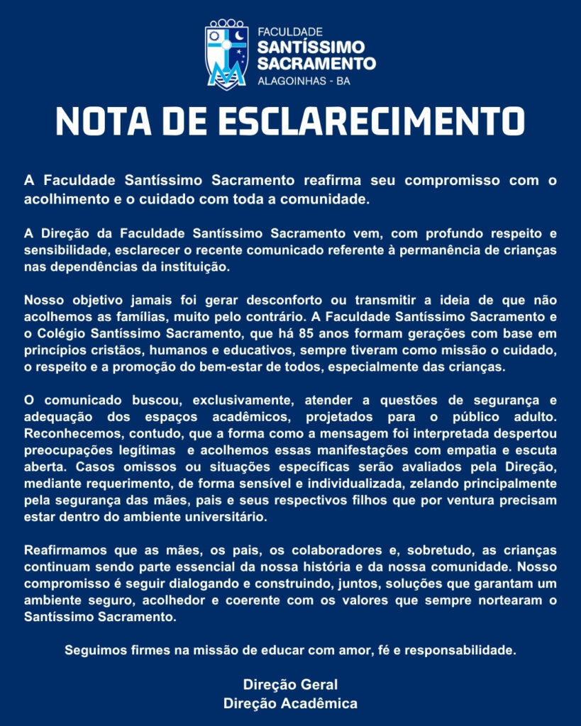 Um comunicado divulgado pela Faculdade Santíssimo Sacramento, em Alagoinhas (BA), gerou ampla repercussão nas redes sociais nesta semana.