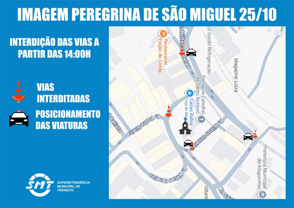 A Superintendência Municipal de Trânsito de Alagoinhas (SMT) informa à população que, das 14h do dia 25 de outubro até às 9h do dia 26 de outubro, será realizado o evento de acolhimento à imagem de São Miguel, na Catedral de Santo Antônio (Igreja do Galo).